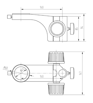 型號名稱:SF5升降組 說明: ● 金屬燕尾滑塊,立柱安裝孔直徑Φ 25mm ● 鏡體安裝孔直徑Φ 45mm ,兩孔中心距 140mm